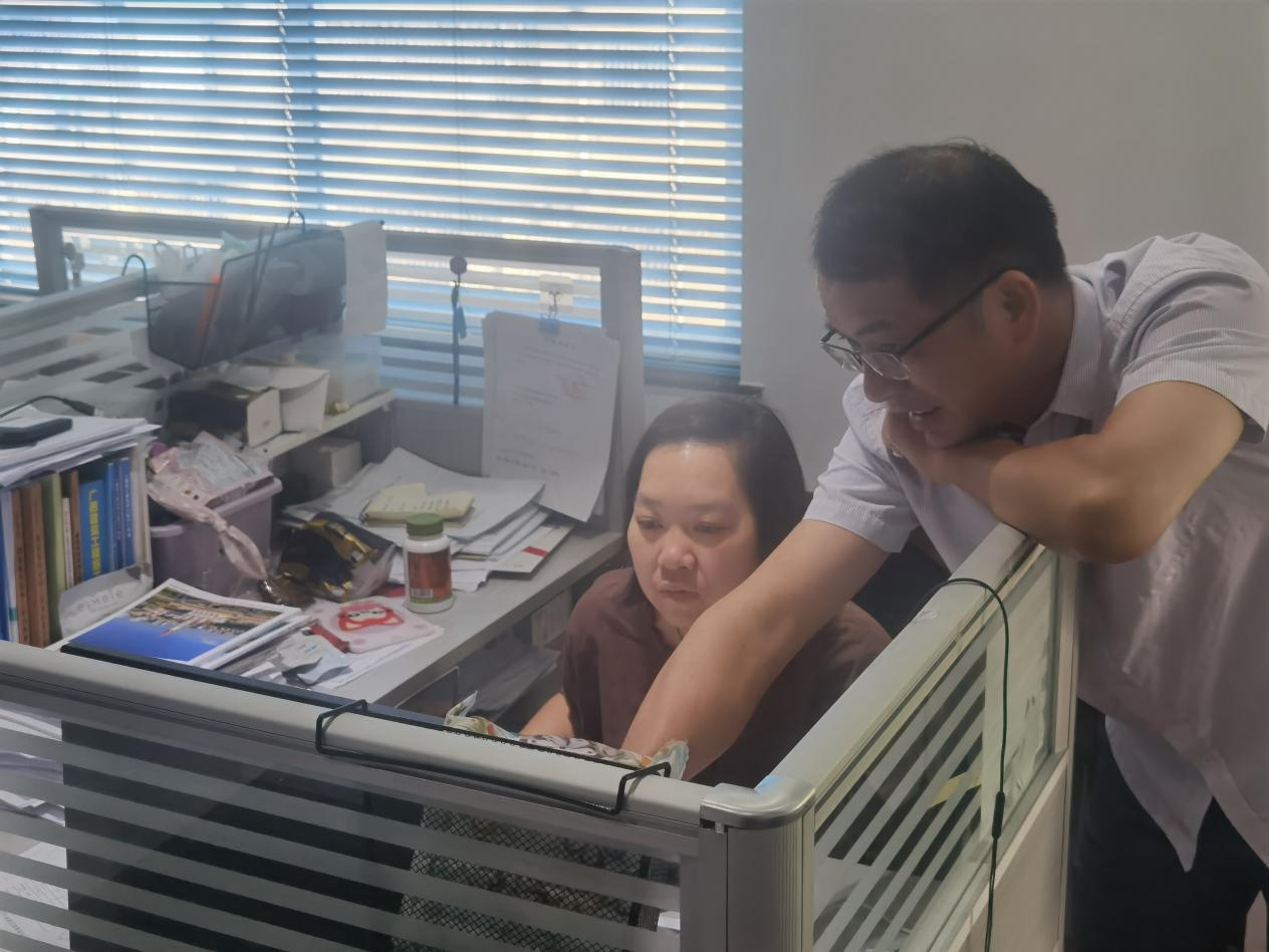 總工辦總工黃群在檢查分公司成果文件并指導業(yè)務員規(guī)范開展相關(guān)工作