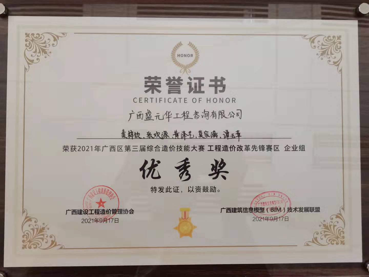 2021年廣西區(qū)第三屆綜合造價(jià)技能大賽(以下簡(jiǎn)稱“大賽”)的系列比賽已全部結(jié)束,在9月17日的頒獎(jiǎng)典禮上,公司參賽團(tuán)隊(duì)以優(yōu)異的成績(jī)?cè)诒緦眉寄艽筚愔性俅问斋@榮譽(yù):榮獲工程造價(jià)改革先鋒賽區(qū)個(gè)人組第一名和企業(yè)組優(yōu)秀獎(jiǎng)、企業(yè)數(shù)字化開拓者賽區(qū)企業(yè)組三等獎(jiǎng)。